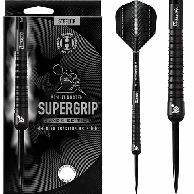 Supergrip 90% Black Edition darts are supplied with Black Supergrip midi shafts, new 100 micron Supergrip Black Edition flights and are match weighed to +/- 0.05g.